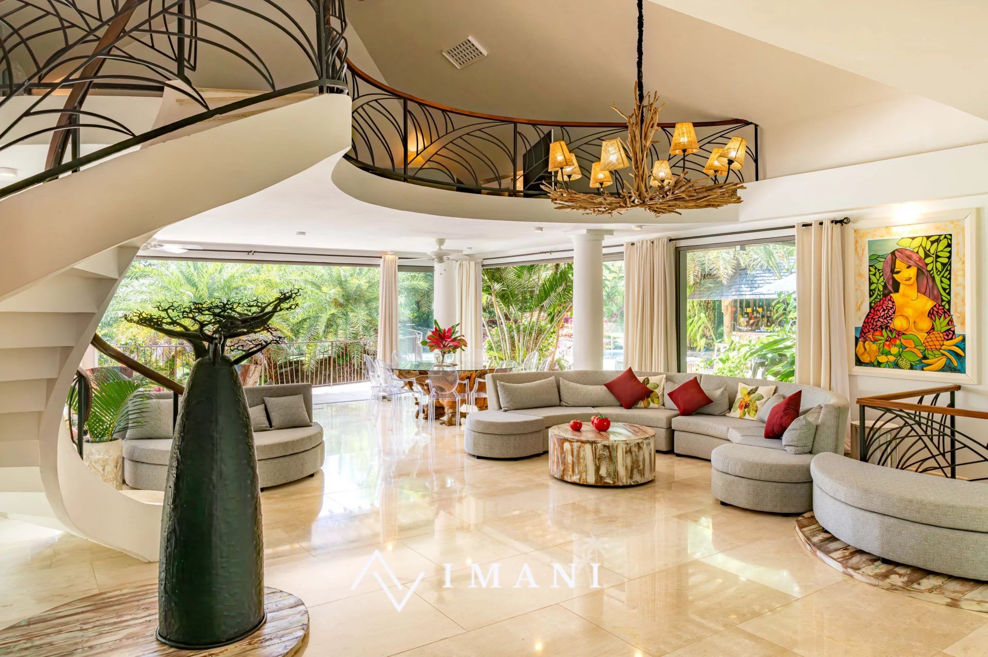 À l’extérieur, une grande piscine de 15 x 7 m, un espace repas couvert et un bar permettent de profiter pleinement du cadre tropical.