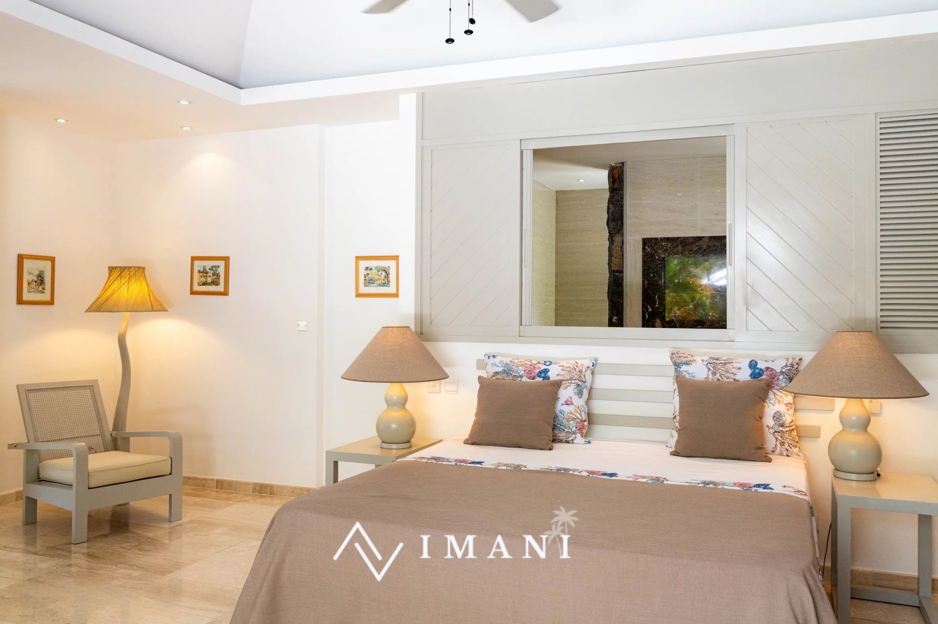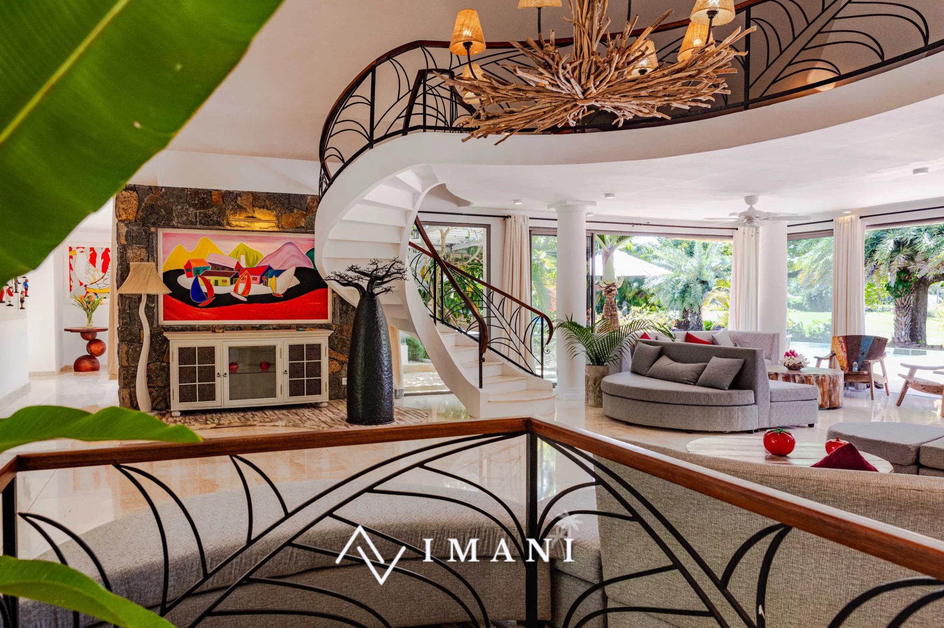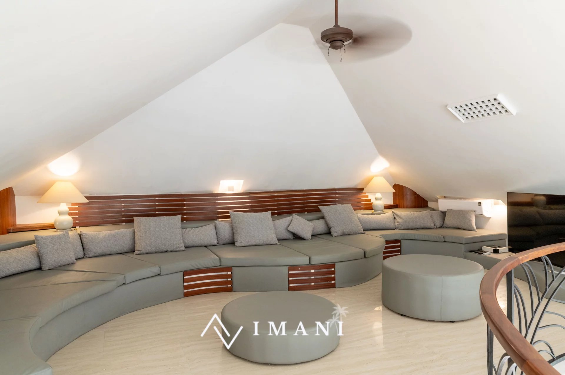 Elle comprend huit chambres, dont deux pour enfants, un salon-salle à manger spacieux, un coin TV en mezzanine et une cuisine équipée avec arrière-cuisine.