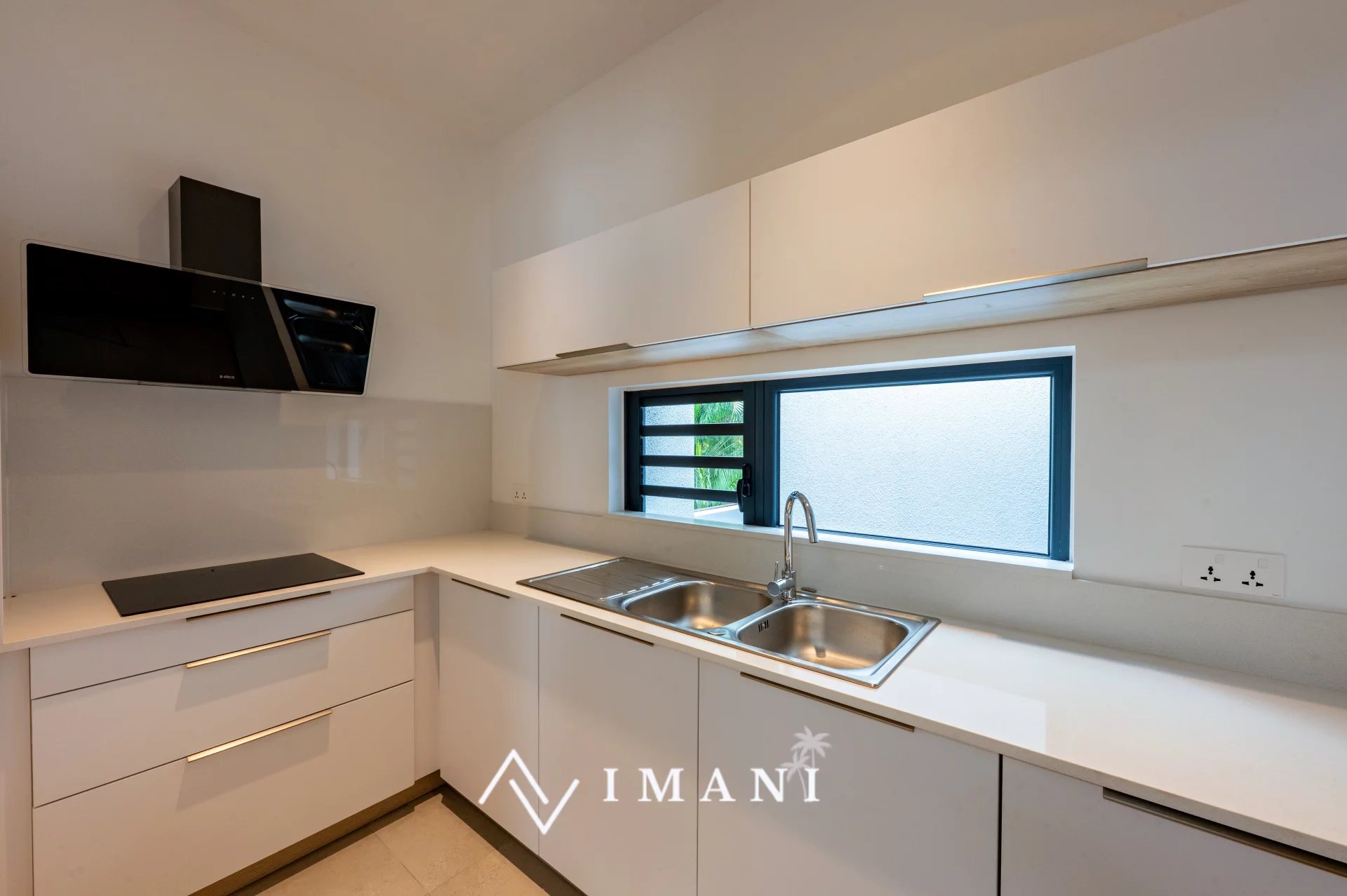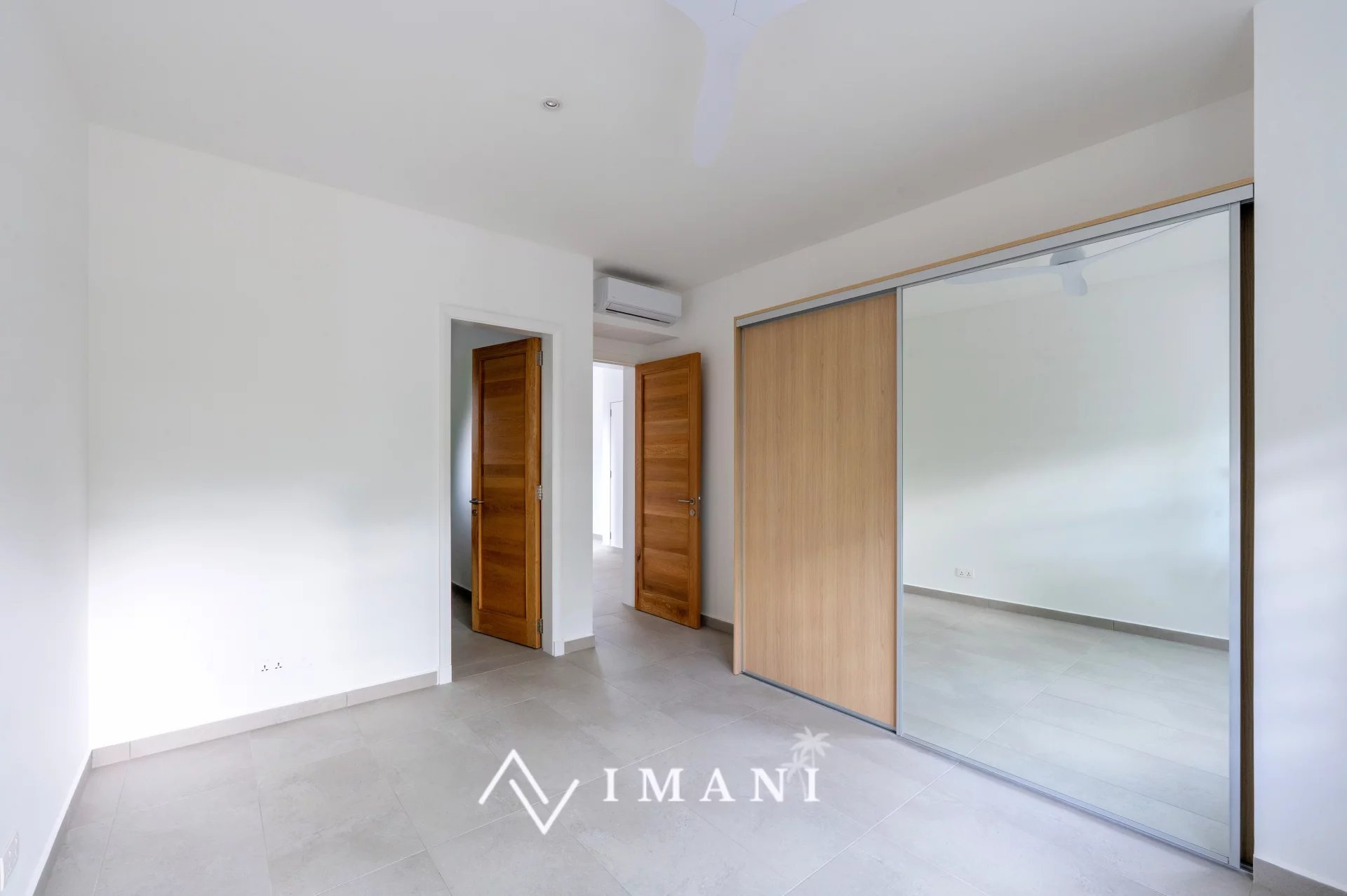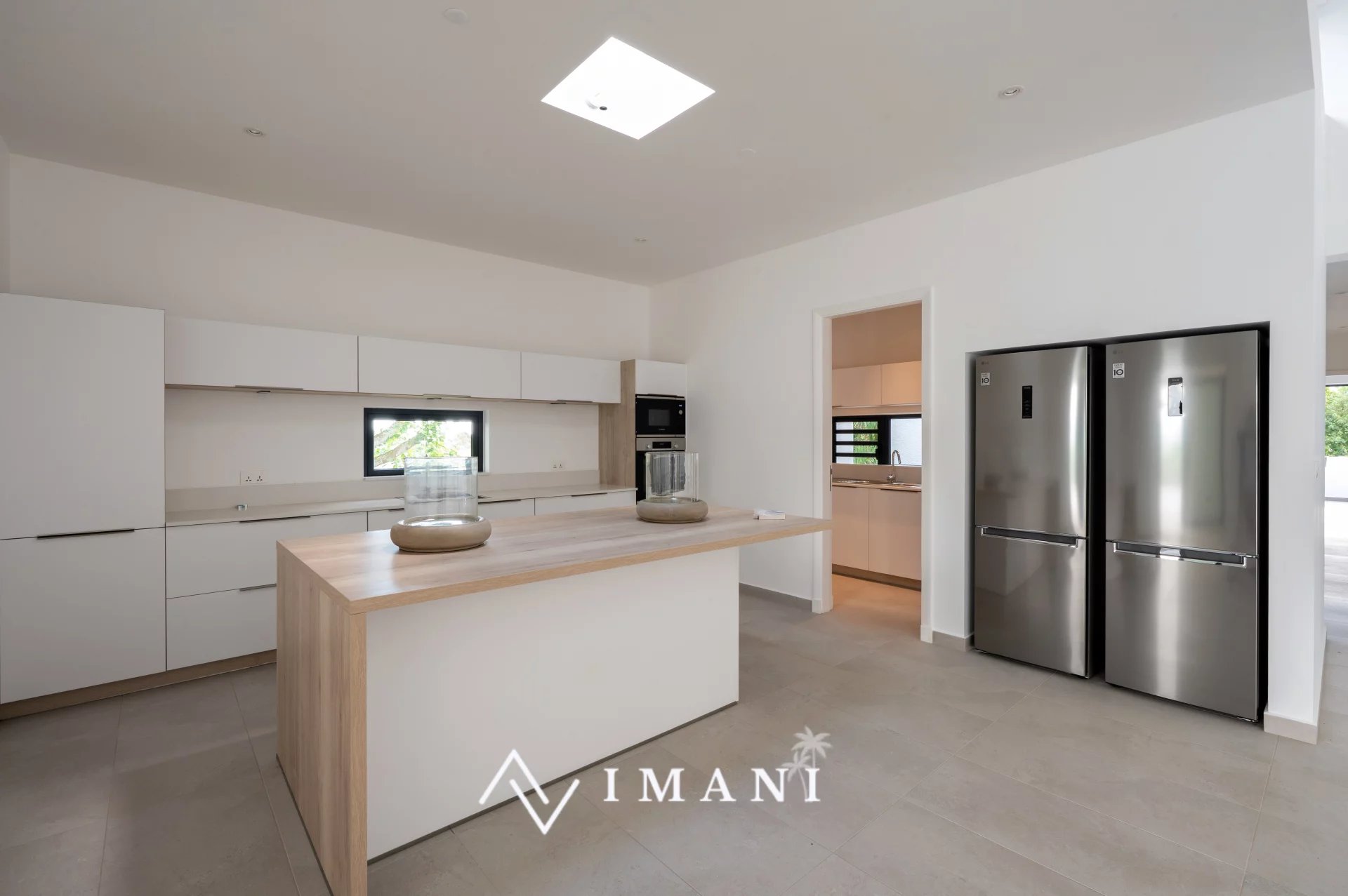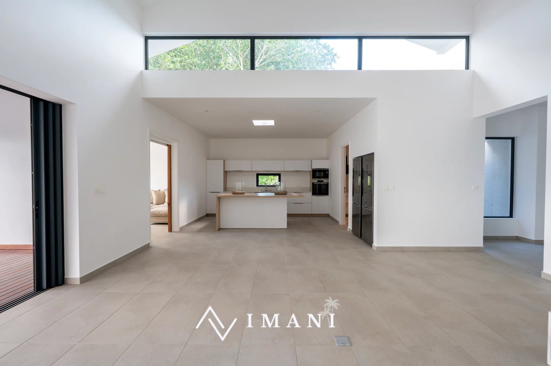 Il se compose d’un vaste séjour avec espace TV et salle à manger, d’une cuisine équipée avec arrière-cuisine, de quatre chambres dont une master suite, ainsi que d’un WC invité et d’une buanderie. Une véranda couverte complète les espaces intérieurs.