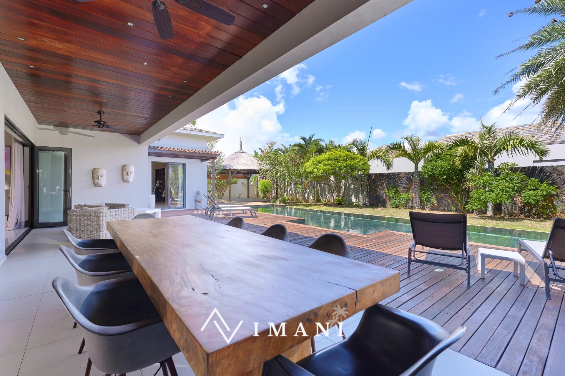La terrasse couverte et le jardin paysager offrent un cadre idéal pour profiter du climat tropical.